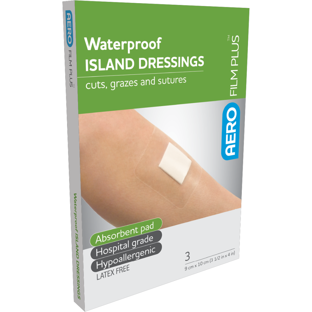 Aerofilm Plus Waterproof Island Dressing 9 x 10cm 3 Pack is a sterile, waterproof adhesive dressing designed to protect minor wounds while providing a soft, absorbent central pad for effective exudate management. Each dressing measures 9cm x 10cm, making it suitable for covering small to medium-sized cuts, grazes, sutured wounds, and post-procedural sites.