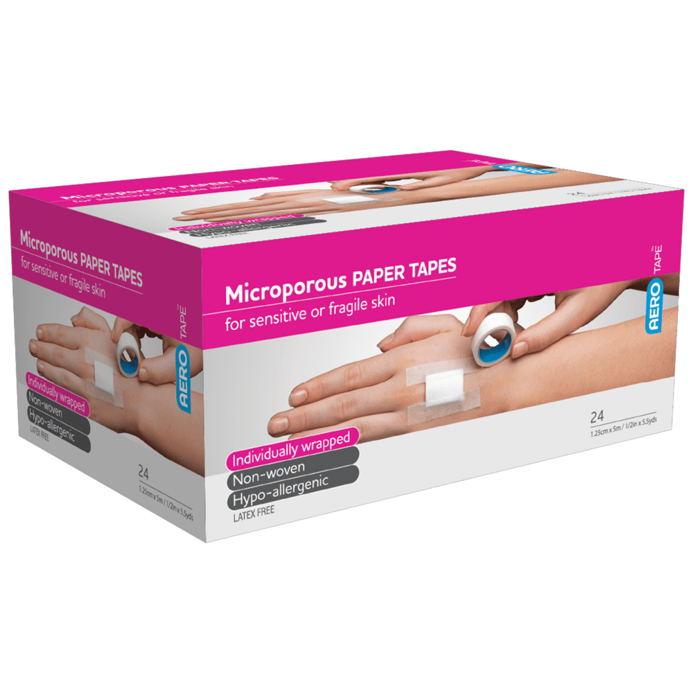 Aerotape White Microporous Paper Tape 1.25cm x 5m Box/24 is a gentle, breathable medical adhesive tape designed for secure yet low-trauma fixation across frequent clinical and first aid applications. Manufactured from soft microporous paper, the tape allows air and moisture vapour to pass through, helping maintain skin integrity and reduce the risk of irritation during extended or repeated use. The narrow 1.25cm width makes it particularly suitable for smaller dressings, paediatric use, facial applications, and areas requiring precise placement.