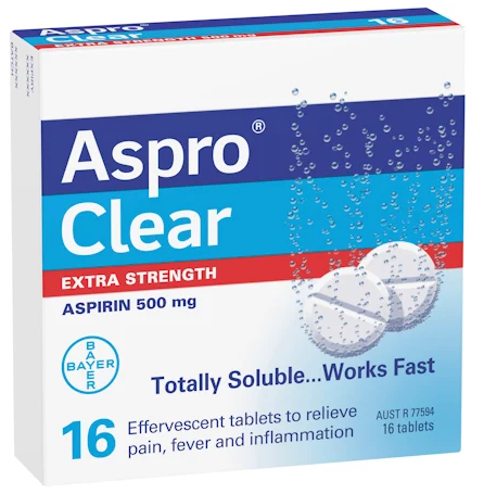 Aspro Clear Extra Strength provides fast-acting relief from pain, inflammation, and fever in a convenient effervescent tablet. Each tablet contains 500mg aspirin, an analgesic, anti-inflammatory, and antipyretic agent that works to ease common aches and pains while reducing fever.