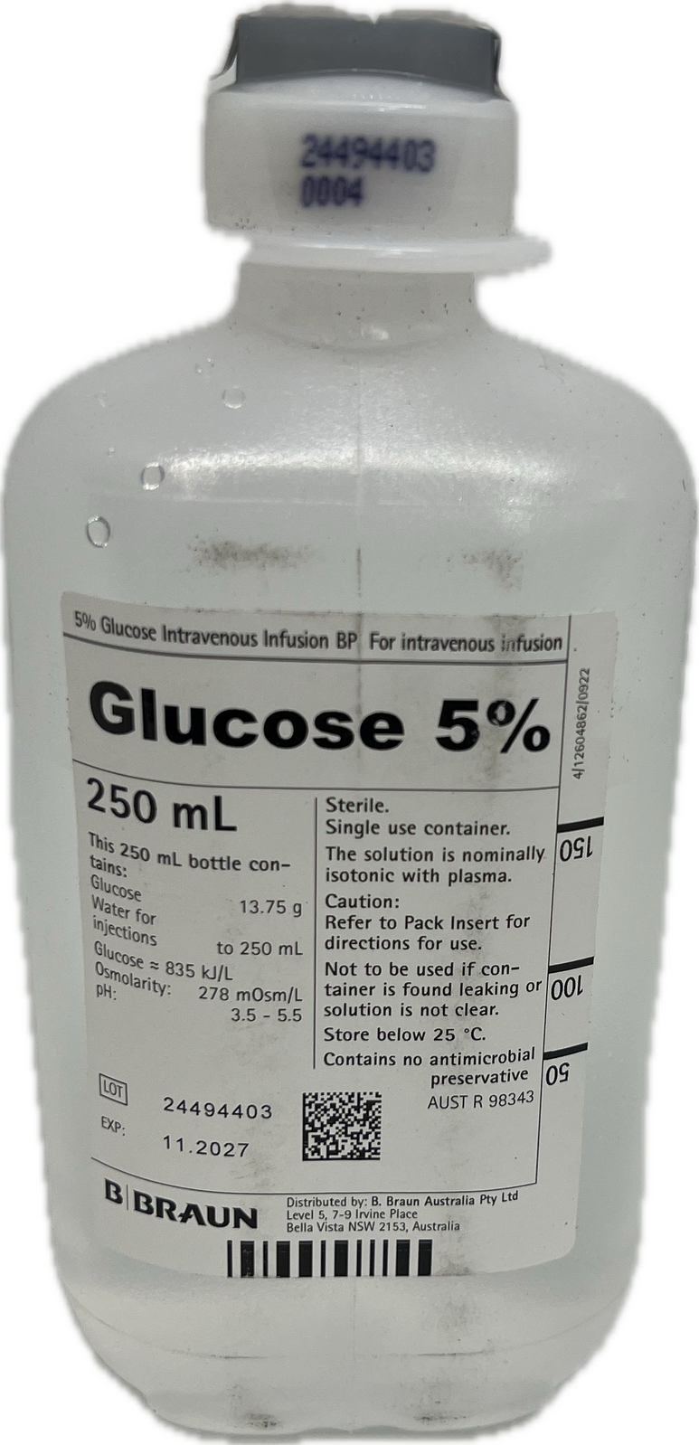 A glucose 5 g/100 ml infusion is not a significant calorie source but can provide transient improvement of hypoglycaemia.