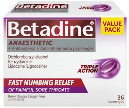 Betadine Anaesthetic Berry Flavoured Lozenges provide fast, soothing relief from sore throats caused by irritation, inflammation, minor infections, or vocal strain. Each sugar-free lozenge combines a local anaesthetic, anti-inflammatory agent and mild antiseptic to numb pain, calm swelling and help reduce the presence of bacteria in the throat.
