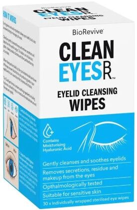 BioRevive EyeClear Sterile Eyelid Cleansing Wipes are individually wrapped, ophthalmologist-recommended wipes designed to gently clean the eyelids, lashes and surrounding eye area. Formulated for sensitive eyes, each sterile wipe helps remove debris, crusting, oil build-up and irritants that may contribute to discomfort, redness or irritation.