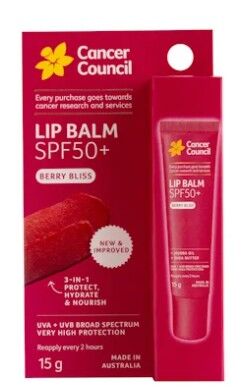 Cancer Council Lip Balm SPF50+ Berry Bliss 15g provides ultra-high, broad-spectrum sun protection for dry, chapped and delicate lips. Infused with a pleasant Berry Bliss flavour, this lip balm helps prevent sunburn, windburn and moisture loss while hydrating and nourishing the lips throughout the day.