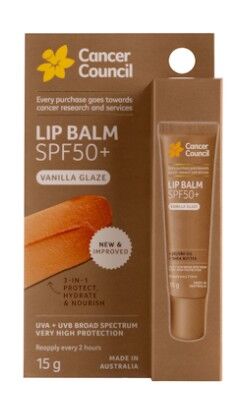 Cancer Council Lip Balm SPF50+ Vanilla Glaze 15g delivers ultra-high, broad-spectrum UVA/UVB protection formulated specifically for the delicate skin of the lips. Enriched with a smooth Vanilla Glaze flavour, this hydrating balm helps shield lips from sunburn, dryness, cracking and environmental damage, while keeping them soft and comfortable throughout the day.