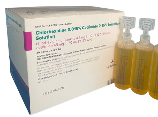 Chlorhex Cetrimide Stube 0.15% 30mL Amp x30 is a sterile antiseptic solution supplied in convenient single-use ampoules, designed for cleansing and disinfecting minor wounds, cuts, abrasions, and skin prior to medical procedures. Combining chlorhexidine and cetrimide, this formulation provides broad-spectrum antimicrobial action to help reduce the risk of infection.