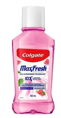 Colgate Max Fresh Mouthwash Watermelon 100mL is a refreshing, alcohol-free oral rinse designed to deliver instant breath freshness while supporting everyday oral hygiene. Infused with cooling freshness technology and a vibrant watermelon flavour, this mouthwash provides an invigorating clean that leaves your mouth feeling fresh, energised, and revitalised after every use. Its compact size makes it ideal for travel, gym bags, work desks, and on-the-go freshness whenever you need it.
