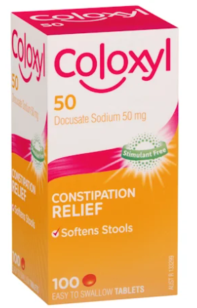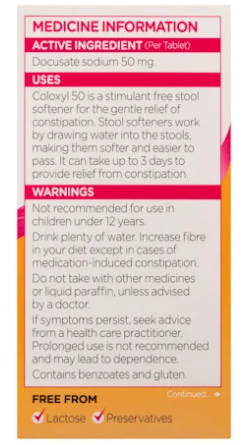 Docusate sodium is the key active in Coloxyl® 50mg. It acts as a stool softener and works by drawing water back into the large intestine increasing the bulk and fluid content in the stool and making it softer and easier to pass.