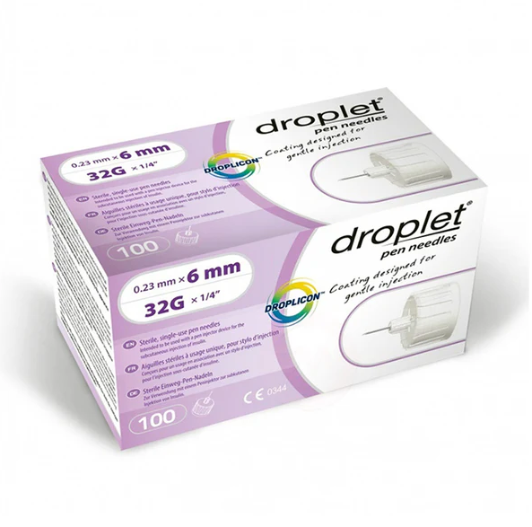 Droplet Pen Needle 32G 6mm Bx100 is a sterile, single-use pen needle designed for subcutaneous injection of insulin using compatible pen devices. With an ultra-fine 32-gauge thickness and a slightly longer 6mm length, it provides a balance between comfort and reliable penetration depth, making it suitable for a wide range of users requiring consistent insulin delivery.