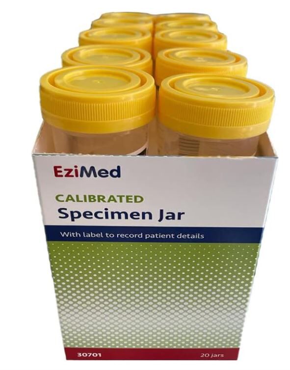 A: Most EziMed specimen jars are approximately 70–90mL capacity, depending on batch specification.