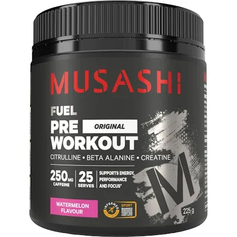 Musashi Pre Workout Watermelon 225g is a high-performance pre-training formula designed to enhance energy, sharpen mental focus, and support endurance during intense exercise. Ideal for athletes and individuals looking to maximise workout output, this scientifically developed blend contains caffeine for alertness, beta-alanine for endurance, citrulline malate and arginine for nitric oxide support, and creatine for improved strength and power.