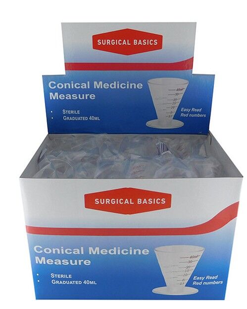 The Surgical Basics Conical Medicine Measure (40mL) is a high-quality, reusable measuring cup designed for accurate dispensing of liquid medicines. Featuring easy-to-read red measurement markings, this conical measure ensures clear visibility and precise dosing for syrups, solutions, and compounded preparations.