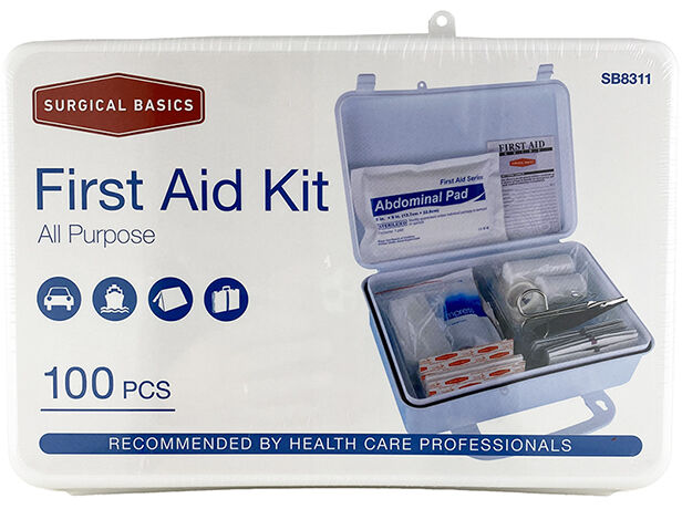 The Surgical Basics First Aid Kit SB8311 is a comprehensive 100-piece emergency care set designed to provide essential medical supplies for treating minor injuries, cuts, burns, and sprains. Suitable for home, workplace, car, or travel use, this durable kit ensures you have the right tools on hand for quick and effective first aid response.