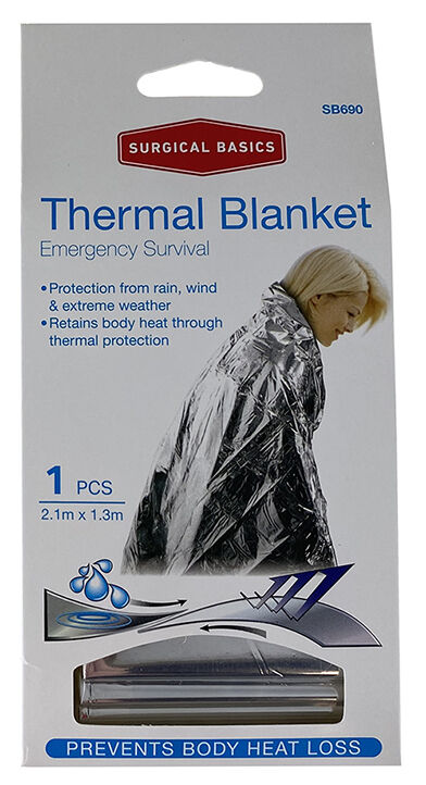 The Surgical Basics Thermal Emergency Blanket SB690 is an essential first aid and emergency survival item designed to retain body heat and prevent hypothermia. Constructed from strong, lightweight metalised polyester film, it reflects up to 90% of body heat to help maintain normal temperature in cold, wet, or shock situations.