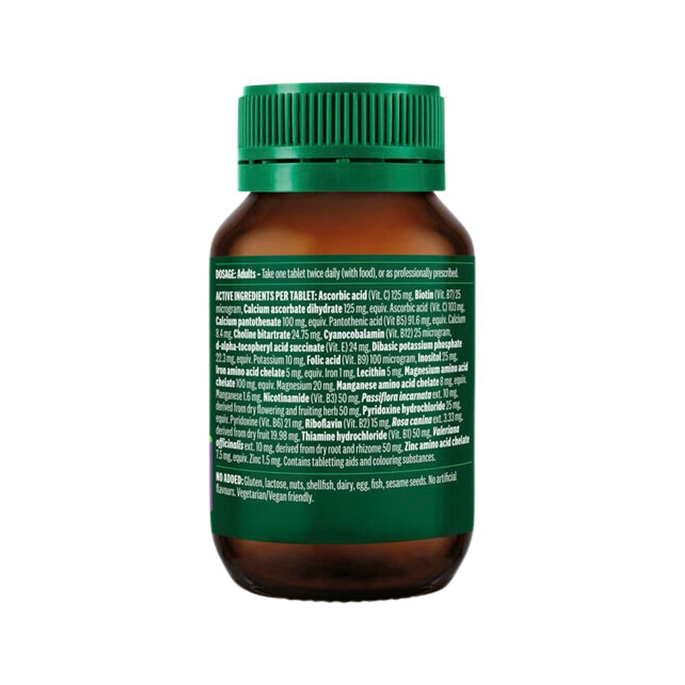 Ingredients: ACTIVE INGREDIENTS PER TABLET: Ascorbic acid (Vit. C) 125 mg, Biotin (Vit. B7) 25 microgram, Calcium ascorbate dihydrate 125 mg (equiv. Ascorbic acid (Vit. C) 103 mg), Calcium pantothenate 100 mg (equiv. Pantothenic acid (Vit B5) 91.6 mg, equiv. Calcium 8.4 mg), Choline bitartrate 24.75 mg, Cyanocobalamin (Vit. B12) 25 microgram, d-alpha-tocopheryl acid succinate (Vit. E) 24 mg, Dibasic potassium phosphate 22.3 mg (equiv. Potassium 10 mg), Folic acid (Vit. B9) 100 microgram, Inositol 25 mg, Iron (II) glycinate 3.65 mg (equiv. Iron 1 mg), Lecithin 5 mg, Magnesium amino acid chelate 100 mg (equiv. Magnesium 20 mg), Manganese amino acid chelate 16 mg (equiv. Manganese 1.6 mg), Nicotinamide (Vit. B3) 50 mg, Passiflora incarnata ext. 10 mg (derived from dry herb 50 mg), Pyridoxine hydrochloride 25 mg (equiv. Pyridoxine (Vit. B6) 21 mg), Riboflavin (Vit. B2) 15 mg, Rosa canina ext. 3.33 mg (derived from dry fruit 19.98 mg), Thiamine hydrochloride (Vit. B1) 48.5 mg, Valeriana officinalis ext. 12.5 mg (derived from dry root 50 mg), Zinc amino acid chelate 7.5 mg (equiv. Zinc 1.5 mg). Contains tabletting aids and colouring substances.