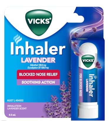 Vicks Inhaler Lavender provides fast, gentle relief from nasal congestion while delivering a calming lavender aroma for added comfort. Designed for convenient, on-the-go use, this compact nasal inhaler helps clear blocked noses caused by colds, allergies, air conditioning, or environmental irritants. The soothing blend of decongestant vapours and lavender scent makes breathing feel easier while promoting a sense of relaxation.